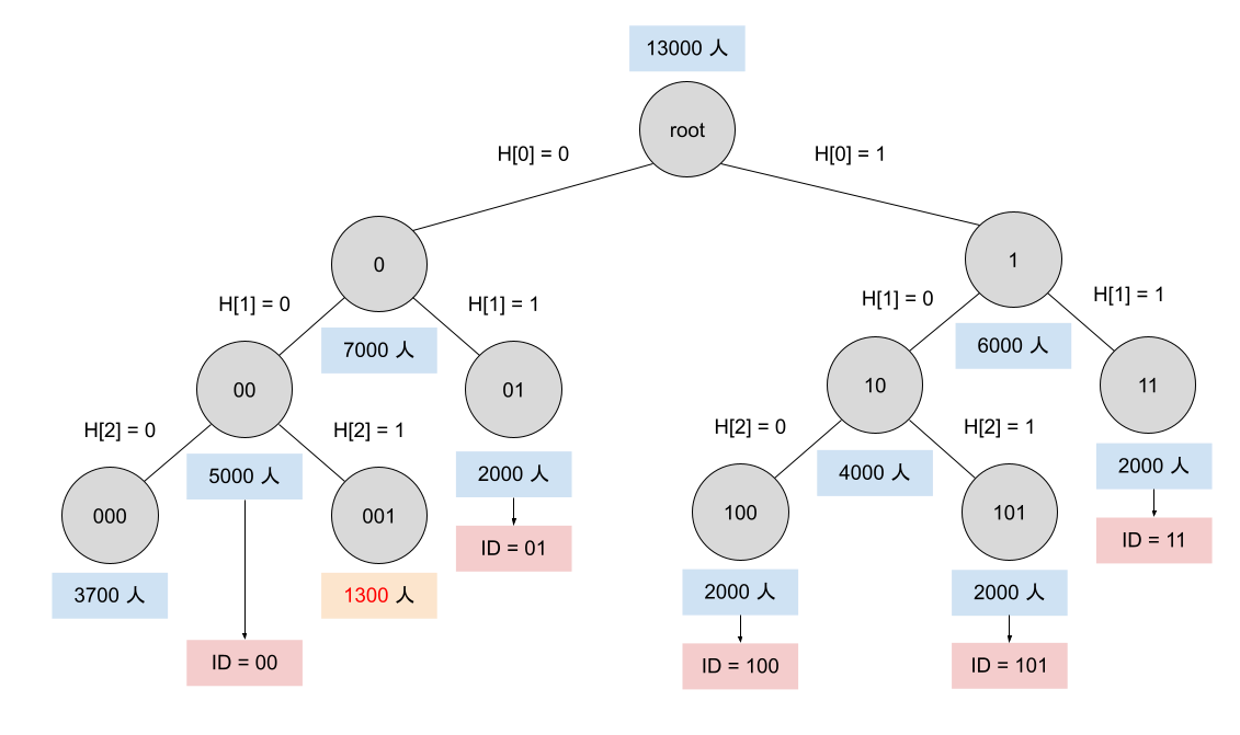 PrefixLSH 是個啟發自 k-d tree 的演算法,用於解決此問題。當每個人把自己的 SimHash 提交上來後,可信任的資料處理者接著會根據大家的 SimHash 建立一個 prefix tree,從 root(對應第一個 bit)開始往下走,當剩餘人數還很多時,就開個分支,0 走左邊 1 走右邊,一直開枝散葉直到剩餘人數將要不足 2000 人,如果再分支就無法維持 2000 人以上就停下來,其 prefix 作為 cohort ID 使用。稍微嚴謹一點說,一開始只有一個 interval,如果 interval 夠大就以第 i-th bit 為依據分為左右兩個 interval,直到 interval 不夠大,不再能維持 k-anonymity 為止。接著,資料處理者把建構完的 prefix tree 公布出來,讓使用者計算他的 cohort ID 應該保留多少 prefix。