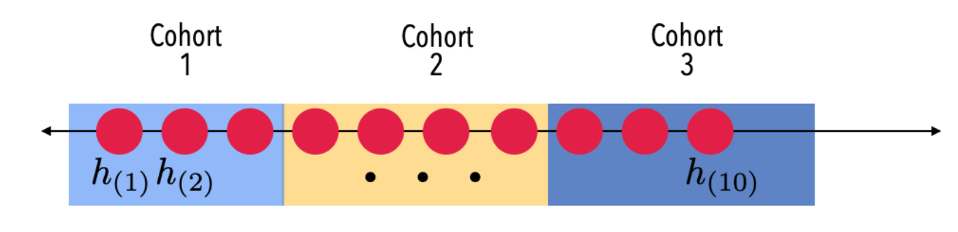 但 SortingLSH 還是需要有參數決定 cohort 該有多大,trivially 地取 k 個作為 interval,雖然可以保證 k-anonymity,但不一定能有效地表達 cluster 的概念,尤其當 (k+1)-th 離 k-th 比較近,離 (k+2)-th 比較遠時,直接把 cohort 界線砍在 k-th 與 (k+1)-th 之間不太合理。