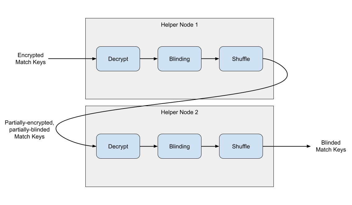 接著,當有一個網站想要了解有多少成功的 conversion 時,他會挑出他想要搜尋的 event 所對應的 match key 密文,接著把這些密文傳給 Leader,Leader 會再把密文發給 Helper Node A 與 B。當 Helper Node A 拿到密文時,他會先用他自己的 private key 解密,並加上 blinding factor,順便 shuffle 一下密文,然後傳給 Helper Node B,後者會再做一次一樣的事情,然後回應給 Leader。Leader 再去比對有多少重複的 (blinded) match key 來算 conversion。