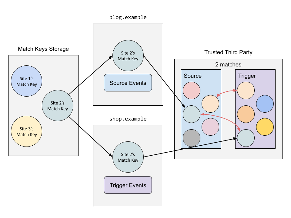 當使用者在 blog.example 點擊廣告(source event),並在 shop.example 完成消費(trigger event),則 blog.example 與 shop.example 會各自獲得發生在自己網站上的 event。他們接著使用 browser 的 API 把 match key 使用前述的第三方可信任伺服器的 public key 加密,然後連同 event 的明文封裝好,並儲存起來。需要注意的是,網站只能透過 browser 的 API 拿到 match key 的密文,網站本身還是看不到 match key。